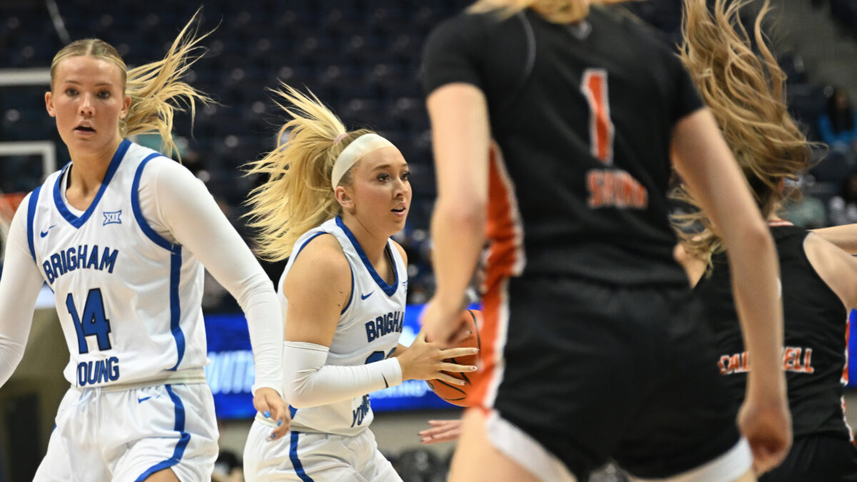 - BYU’s Brinley Cannon looks for a teammate in a women’s college basketball game against Idaho State at the Marriott Center on Thursday, Dec. 11, 2025.