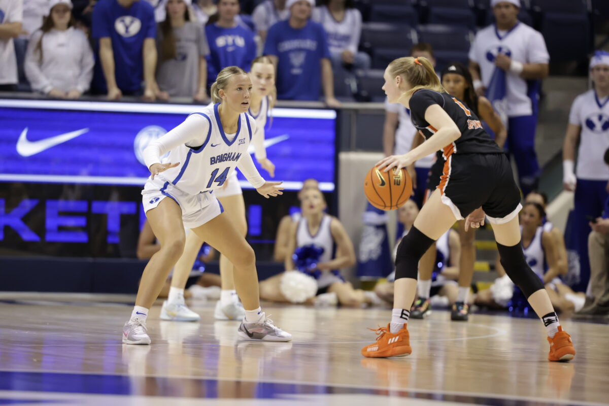 - BYU’s Cambri Barber (14) plays defense against Idaho State in a women’s college basketball game at the Marriott Center on Thursday, Dec. 11, 2025.