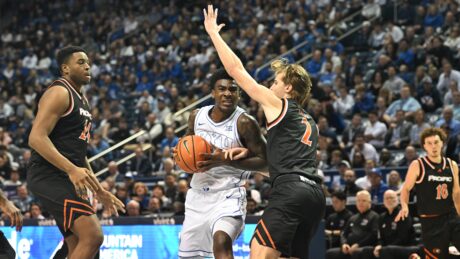 Another key contributor was 6-foot-7 junior Tyler Mrus, who played a season high 20 minutes because freshman guard Aleksej Kostic was ill and didn’t suit up. Mrus came into the game a frigid 3 of 21 (14%) from the 3-point line but made all four triples he attempted and scored a BYU career-high 15 points.