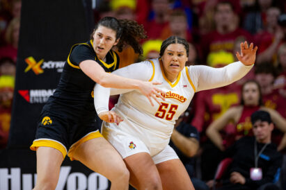 - Iowa center Ava Heiden, left, and Iowa State center Audi Crooks (55) fight for position during an NCAA college basketball game against Iowa in Ames, Iowa, Wednesday, Dec. 10, 2025.