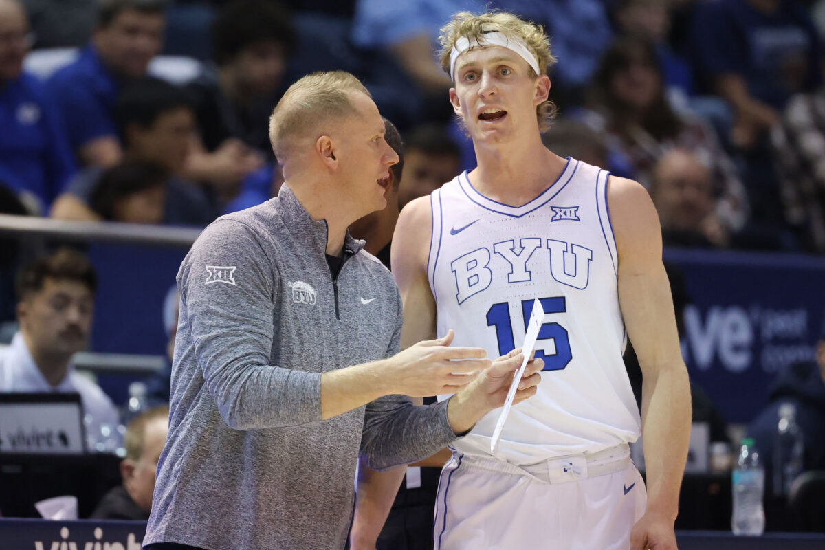 - BYU head coach Kevin Young talks with guard Richie Saunders during the first half of an NCAA college basketball game against Abilene Christian, Friday, Dec. 19, 2025, in Provo, Utah.