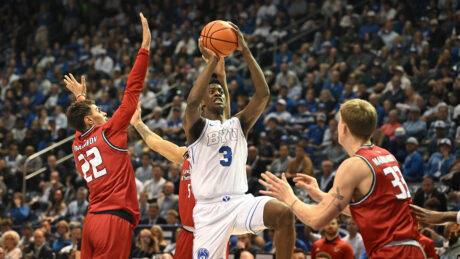- BYU’s AJ Dybantsa splits a pair of defenders on his way to the basket against Eastern Washington a men’s college basketball game at the Marriott Center on Monday, Dec. 22, 2025.