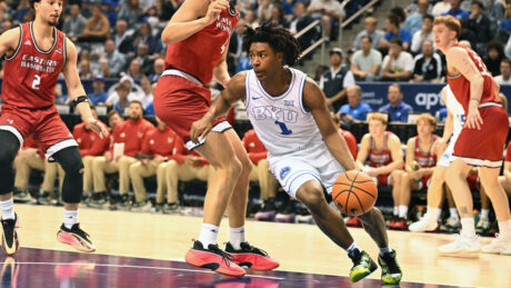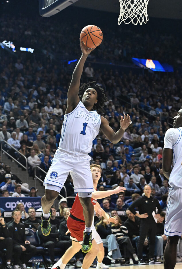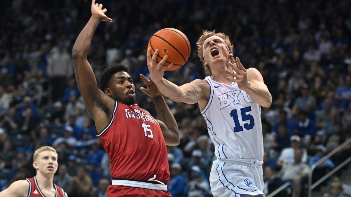 - BYU’s Robert Wright III (1) drives to the basket against Eastern Washington a men’s college basketball game at the Marriott Center on Monday, Dec. 22, 2025.