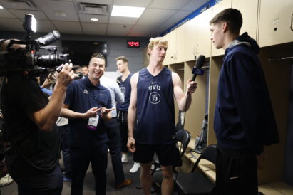 - BYU’s Richie Saunders (left) conducts an interview with teammate Egor Demin in the locker room at Ball Arena in Denver, Colo., on Friday, March 21, 2025.