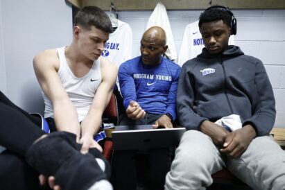 - From left, BYU’s Mihailo Boskovic, coach John Linehan and Kanon Catchings watch video in preparation for their Sweet 16 matchup with Alabama at the Prudential Center in Newark, N.J., on Thursday, March 27, 2025.