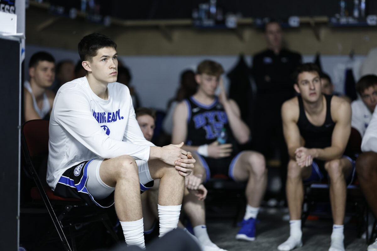 - BYU’s Egor Demin (left) and teammates watch film before their Sweet 16 matchup against Alabama at the Prudential Center in Newark, N.J., on Thursday, March 27, 2025.