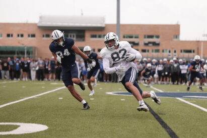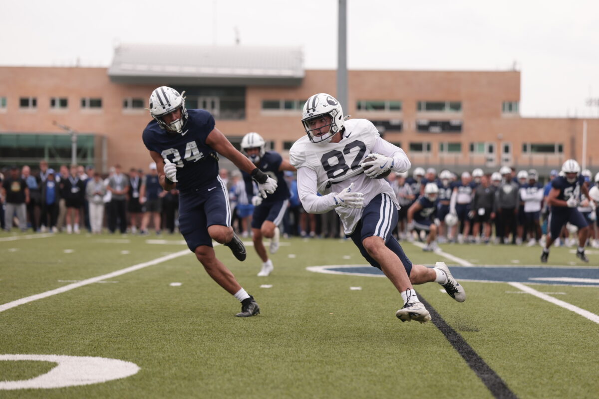 - BYU sophomore tight end Noah Moeaki (82) runs the ball up the field during spring camp in Provo on Friday, March 28, 2025.