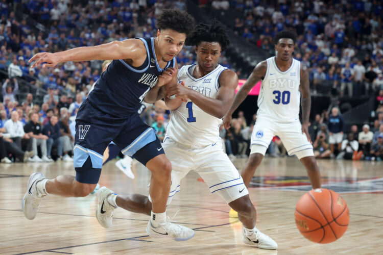 Villanova guard Tyler Perkins (4) and BYU guard Robert Wright III (1) chase after a rebound during the second half of an NCAA college basketball game, Monday, Nov. 3, 2025, in Las Vegas.For many years, the BYU offense was built around players who excelled in ball movement and screens, with a reputation for being great 3-point shooters. Motion offense was the way.