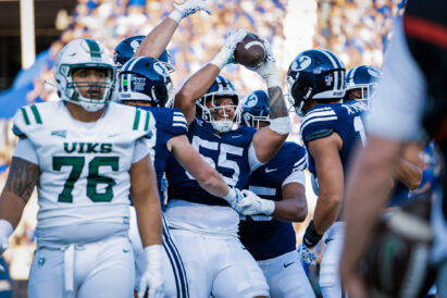 - BYU’s John Taumoepeau (55) celebrates recovering a fumble against Portland State in a college football game at LaVell Edwards Stadium on Saturday, Aug. 30, 2025.