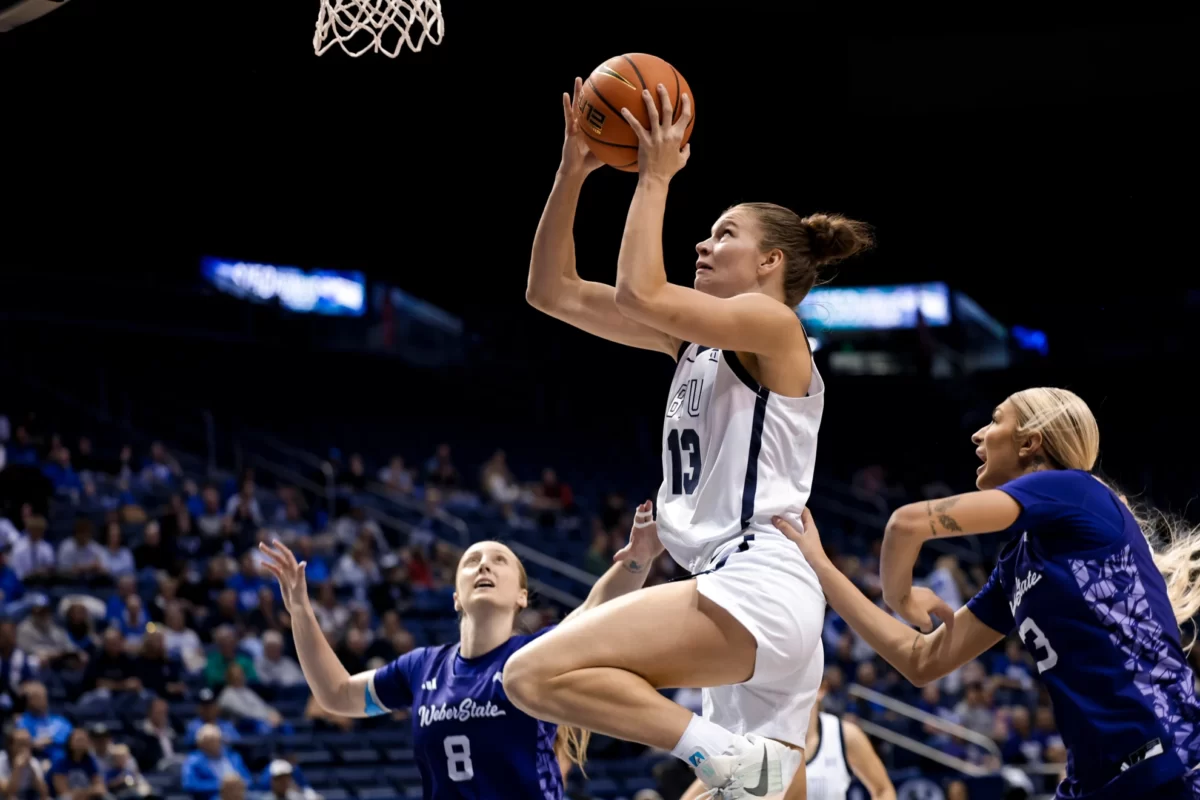 - BYUs Lara Rohkohl goes up for a shot against Weber State in a women’s college basketball game at the Marriott Center on Saturday, Nov. 22, 2025.