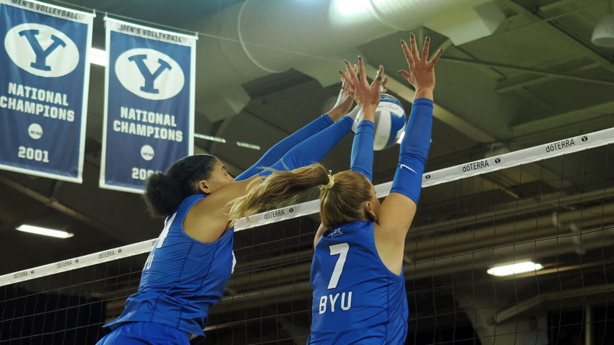 - BYU’s Brielle Kemavor (left) and Alex Bower throw up a block against rival Utah at the Smith Fieldhouse on Wednesday, Nov. 27, 2025.