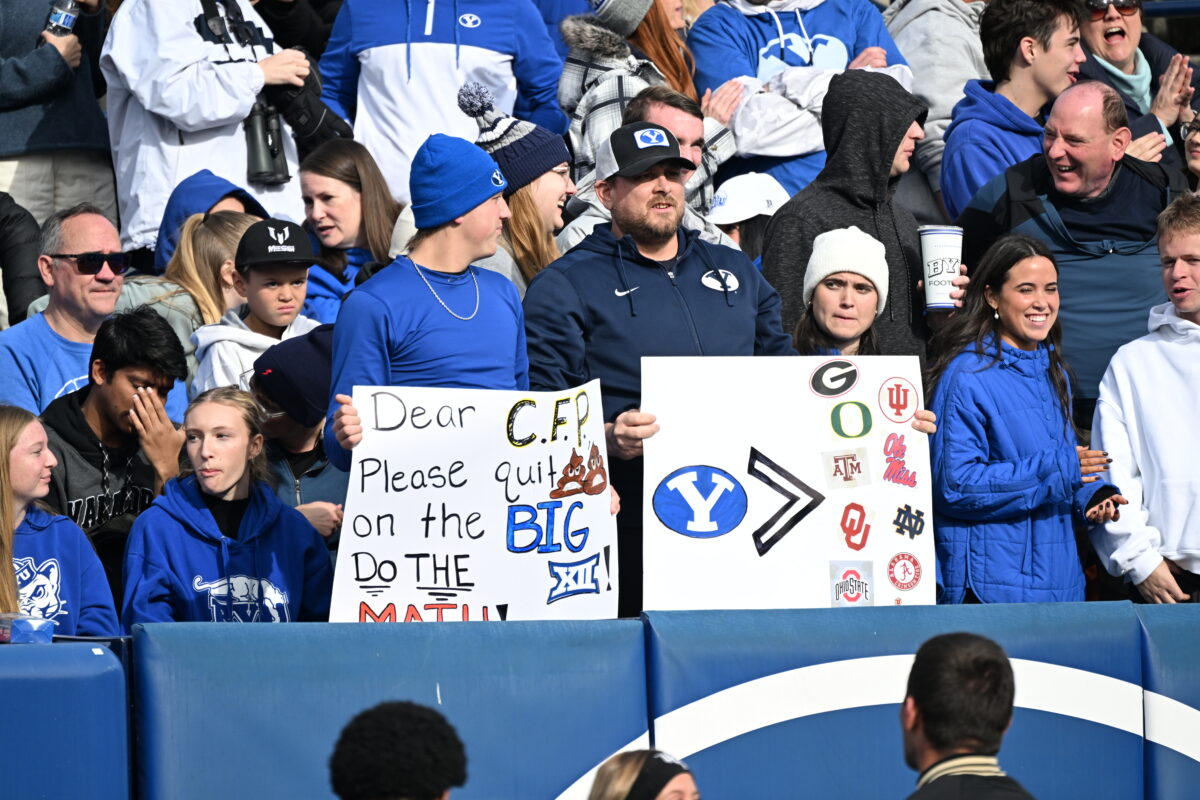- BYU fans hold up signs in a Big 12 football game against UCF at LaVell Edwards Stadium on Saturday, Nov. 29, 2025.