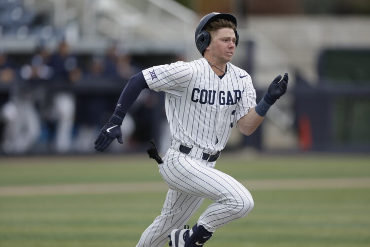 BYU's Crew McChesney runs to first base during a Big 12 baseball game against No. 22 Arizona at Miller Field on Thursday, April 17, 2025.BYU baseball coach Trent Pratt, in conjunction with the Big 12 Conference, has announced the 2026 Cougar baseball schedule that includes 22 home games at Miller Park as well as 32 road contests across eight states.