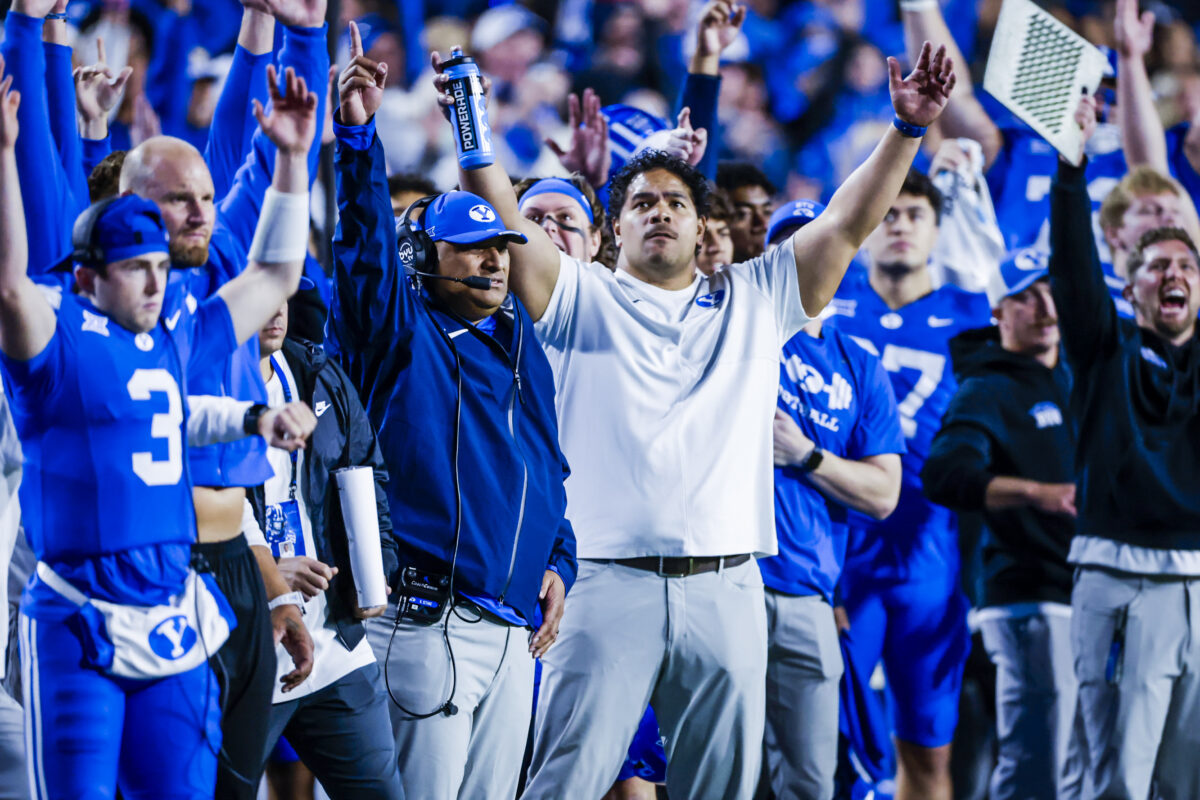 - BYU head football coach Kalani Sitake (with headset) celebrates on the sideline in a 24-21 victory against Utah at LaVell Edwards Stadium on Saturday, Oct. 18, 2025.