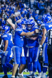 - BYU players celebrate a 24-21 Big 12 football victory against Utah at LaVell Edwards Stadium on Saturday, Oct. 18, 2025.