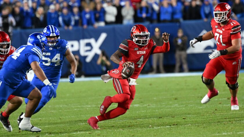 Utah quarterback Devin Dampier runs with the ball in a Big 12 college football game with BYU in Provo on Saturday, Oct. 18, 2025.At the new conference after his team’s 24-21 loss to BYU on Saturday, Utah head coach Kyle Whittingham was quick to point out the statistical edge the Utes had in many categories.