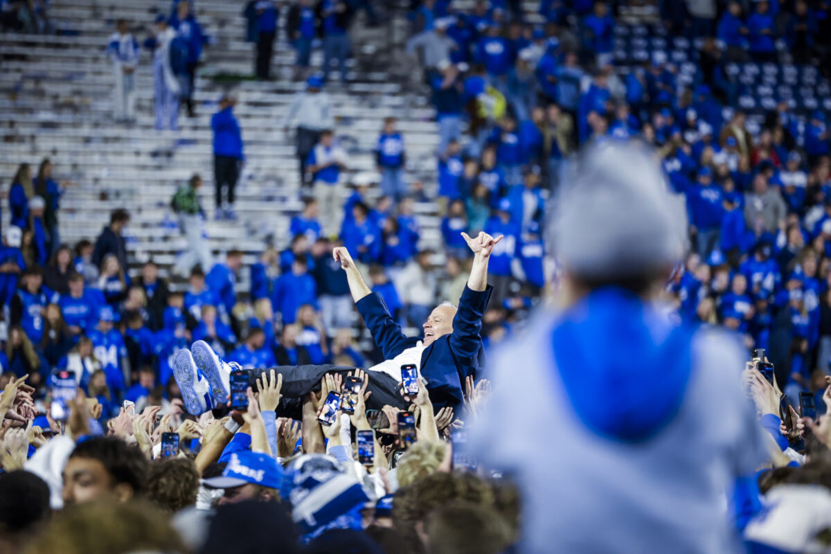 - BYU president Shane Reese crowd surfs after the Cougars’ 24-21 victory against rival Utah at LaVell Edwards Stadium on Saturday, Oct. 18, 2025.