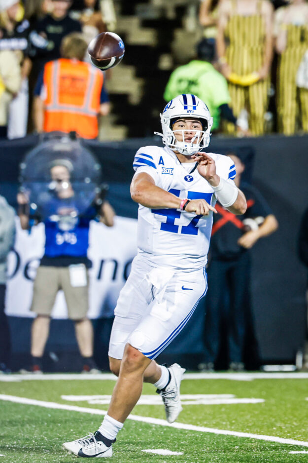 - BYU quarterback Bear Bachmeier throws a pass against Colorado in a Big 12 football game at Folsom Field in Boulder on Saturday, Sept. 27, 2025.