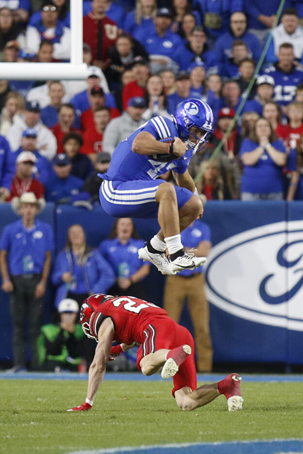 - BYU’s Bear Bachmeier leaps over Utah’s Jackson Bennee in a Big 12 football game at LaVell Edwards Stadium on Saturday, Oct. 18, 2025.