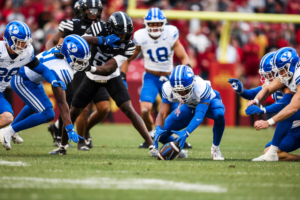 - BYU’s Mory Bamba recovers the football after a Cougar punt in a Big 12 game against Iowa State at Ames, Iowa, on Saturday, Oct. 25, 2025.