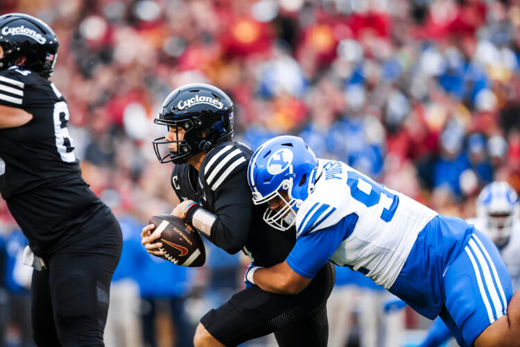 BYU's Anisi Purcell, right, sacks Iowa State quarterback Rocco Becht in a Big 12 football at Ames, Iowa, on Saturday, Oct. 25, 2025.Here’s our weekly power rankings of Big 12 teams with a look at their schedules and matchups.