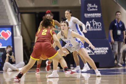 - BYU’s Kailey Woolston (10) defends Iowa State’s Arianna Jackson during a Big 12 women’s basketball game at the Marriott Center on Saturday, Jan. 6, 2024.