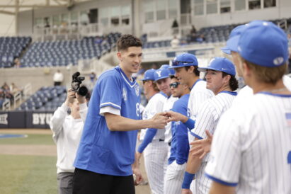 - Former Cougars basketball standout and current Brooklyn Nets guard Egor Demin (left) greets players after throwing out the first pitch against Arizona State at Miller Park on Thursday, April 16, 2026.