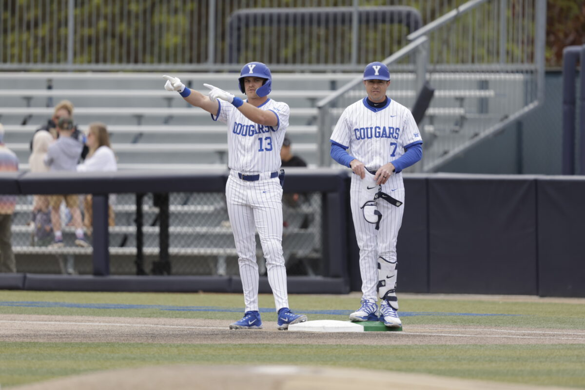 - BYU’s Bryker Hurdsman (13) signals to him teammates after reaching base safely against Arizona State in a Big 12 baseball game at Miller Park on Thursday, April 16, 2026.