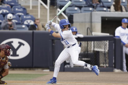 - BYU’s Luke Anderson takes a swing against Arizona State in a Big 12 baseball game at Miller Park on Thursday, April 16, 2026.