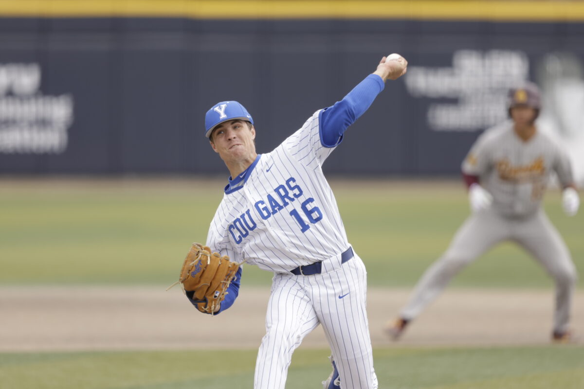 - BYU’s Wayland Crane pitches against Arizona State in a Big 12 baseball game at Miller Park on Thursday, April 16, 2026.