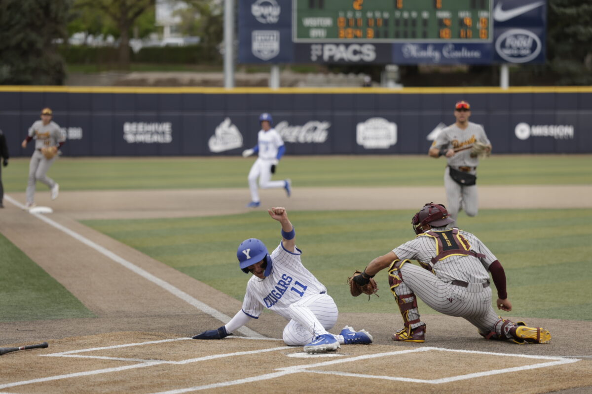 - BYU’s Luke Anderson slides in safely at home against Arizona State in a Big 12 baseball game at Miller Park on Thursday, April 16, 2026.