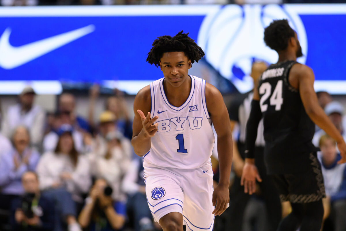 - BYU guard Robert Wright III (1) celebrates after scoring a 3-point basket during the second half of an NCAA college basketball game against Colorado, Saturday, Feb. 14, 2026, in Provo, Utah.