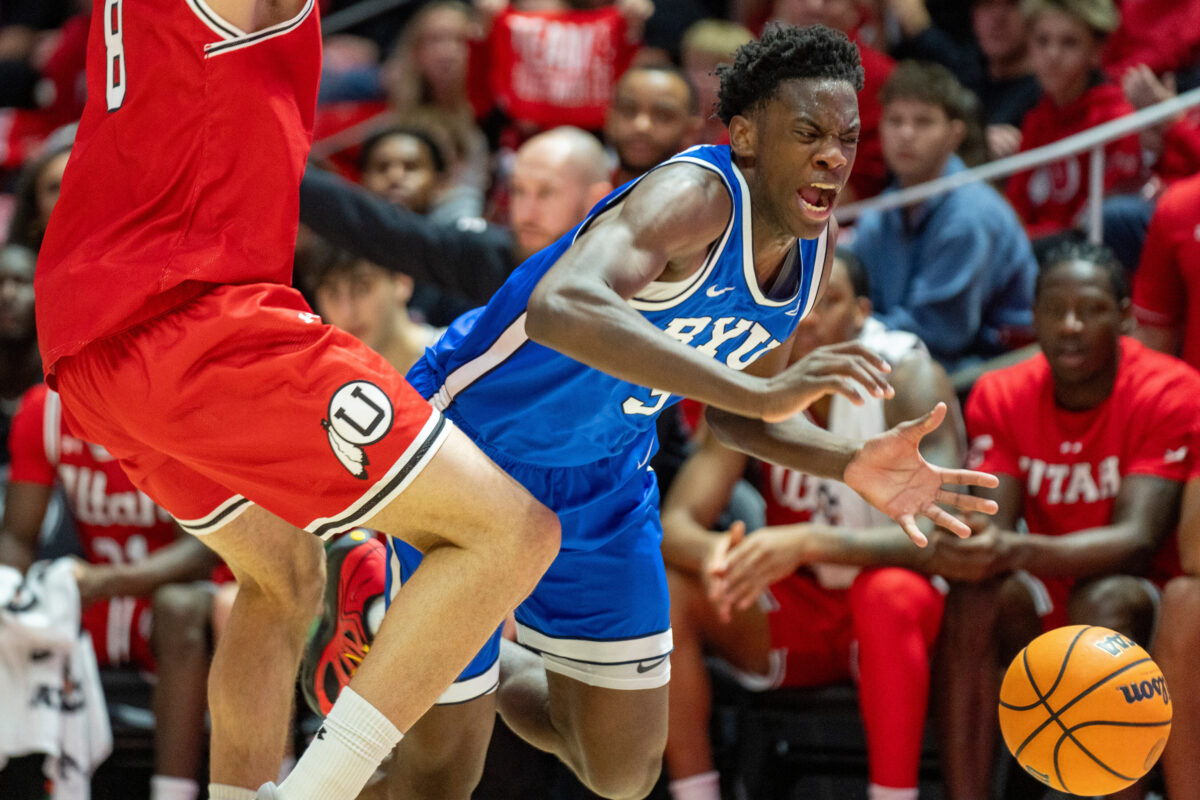 - BYU guard Robert Wright III (1) goes to the hoop as Utah forward Seydou Traore, left, defends during the first half of an NCAA basketball game Saturday, Jan. 10, 2026, in Salt Lake City.