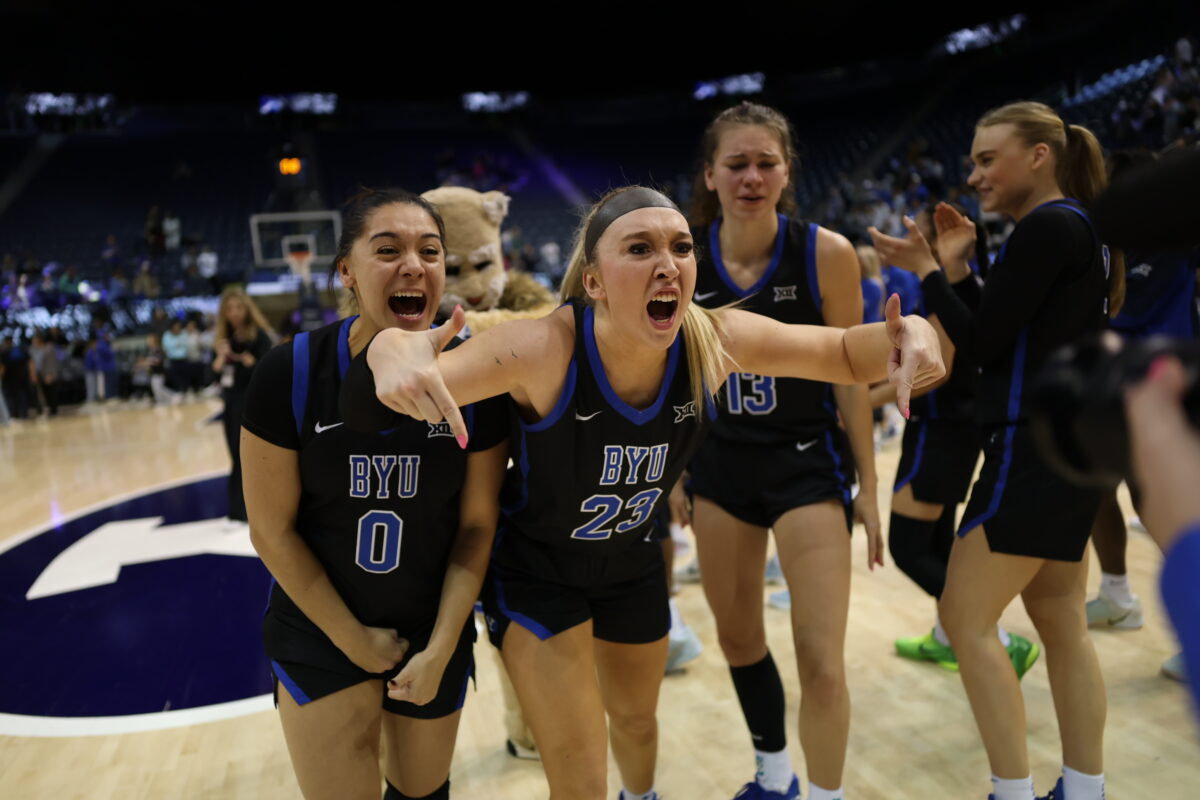 - BYU’s Marya Hudgins (right) and Arielle Mackey-Williams celebrate a 73-61 upset of No. 19 Texas Tech in the Marriott Center on Wednesday, Jan. 21, 2026.