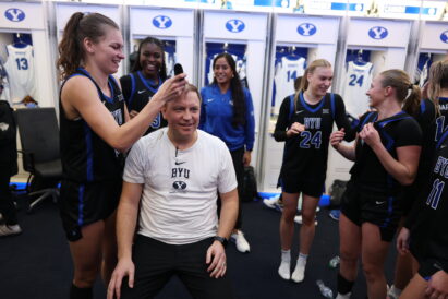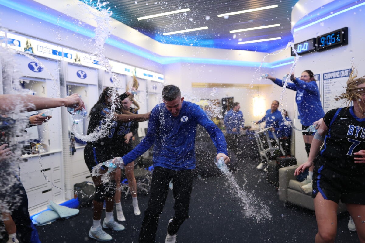 - BYU women’s basketball coach Lee Cummard runs through the locker room as his team celebrates a 73-61 upset of No. 19 Texas Tech at the Marriott Center on Wednesday, Jan. 21, 2026.
