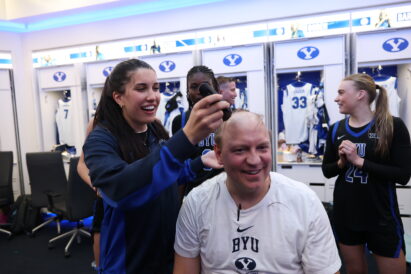 - BYU’s Lara Rohkohl (left) helps shave the head of assistant coach Andrew Curtis after the Cougars upset No. 19 Texas Tech 73-62 at the Marriott Center on Wednesday, Jan. 21, 2026.