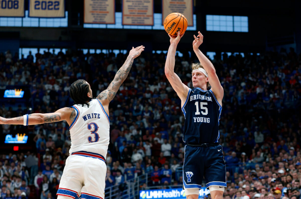 - BYU guard Richie Saunders (15) prepares to shoot a 3-point basket as Kansas guard Tre White (3) defends during the second half of an NCAA college basketball game, Saturday, Jan. 31, 2026, in Lawrence, Kan.