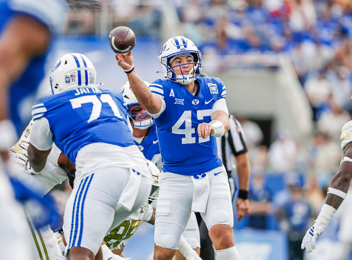 - BYU quarterback Bear Bachmeier throws a pass against Georgia Tech in the Pop-Tarts Bowl in Orlando, Fla., on Saturday, Dec. 27, 2025.