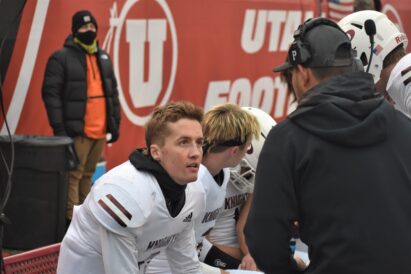- Lone Peak quarterback Easton Comer (left) talks to a coach after throwing a touchdown pass in the 6A state championship game against Corner Canyon at Rice-Eccles Stadium in Salt Lake City on Friday, Nov. 19, 2021. (Darnell Dickson/Daily Herald)