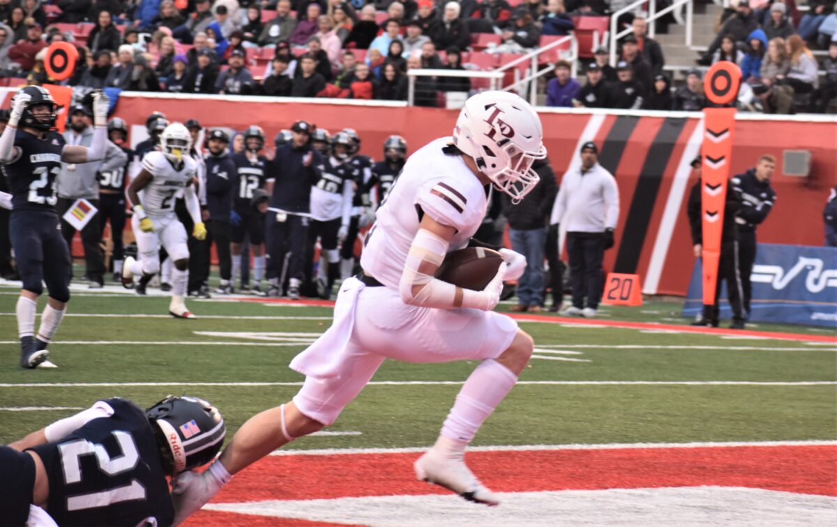 - Lone Peak’s Crew McChesney (white) scores a touchdown against Corner Canyon in the 6A state championship game at Rice-Eccles Stadium in Salt Lake City on Friday, Nov. 19, 2021. (Darnell Dickson/Daily Herald)