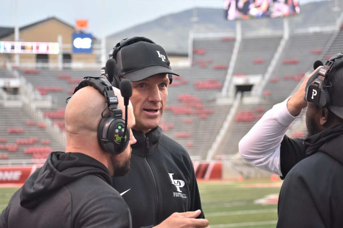 - Lone Peak defensive coordinator Ryan Denney (center) talks with fellow coaches during the 6A state championship game against Corner Canyon at Rice-Eccles Stadium in Salt Lake City on Friday, Nov. 19, 2021. (Darnell Dickson/Daily Herald)