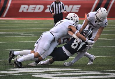 - Lone Peak’s Dallin Moore (23) and Mason Patane close in on Corner Canyon wide receiver Jett Meine during the 6A state championship game at Rice-Eccles Stadium on Friday, Nov. 19, 2021. (Darnell Dickson/Daily Herald)