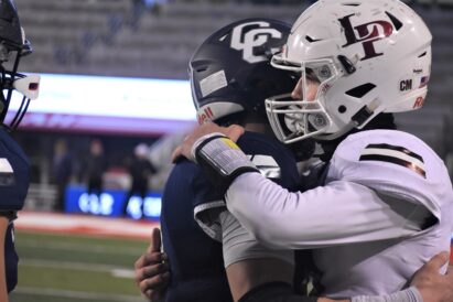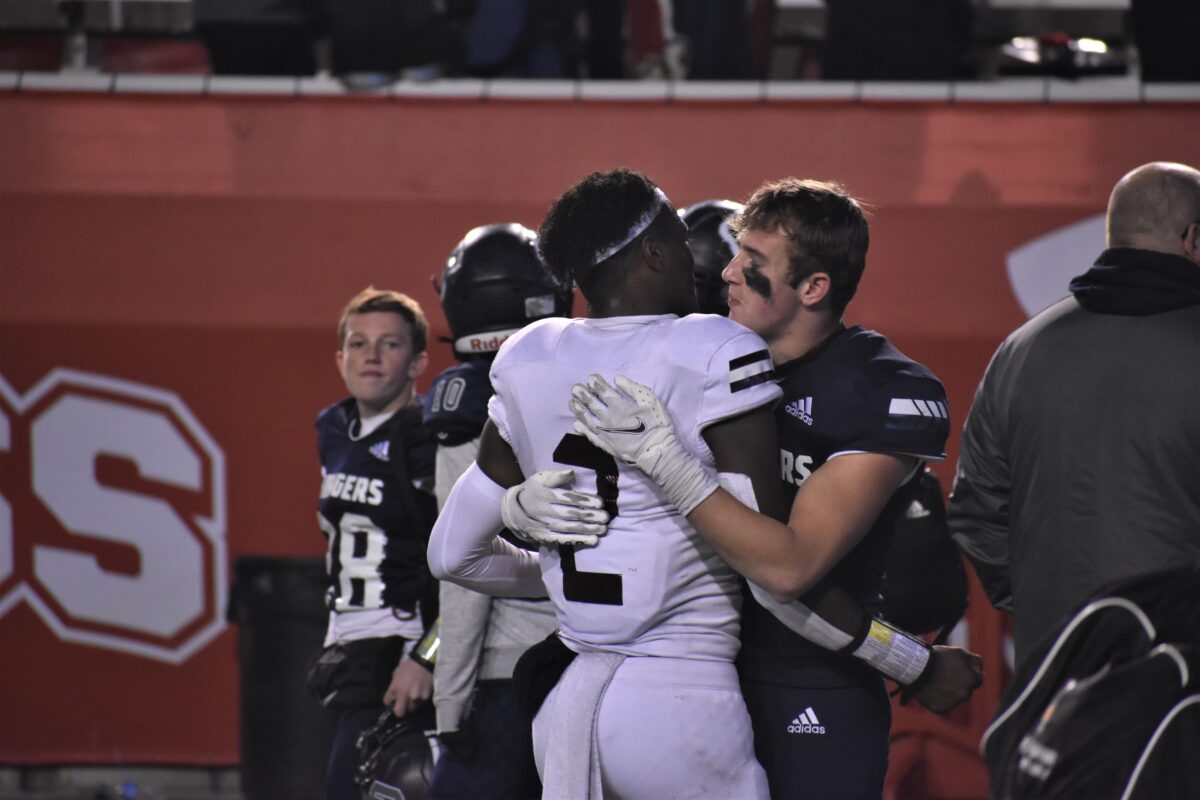 - Lone Peak’s Luke Hyde (2) consoles Corner Canyon’s Jett Meine at the conclusion of the 6A state football championship game at Rice-Eccles Stadium in Salt Lake City on Friday, Nov. 19, 2021. (Darnell Dickson/Daily Herald)