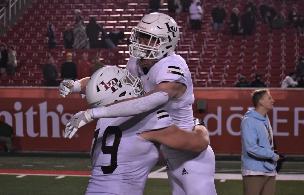 - Lone Peak’s Mason Pantane, right, celebrates winning the 6A state championship game with a teammate at Rice-Eccles Stadium in Salt Lake City on Friday, Nov. 19, 2021. (Darnell Dickson/Daily Herald)