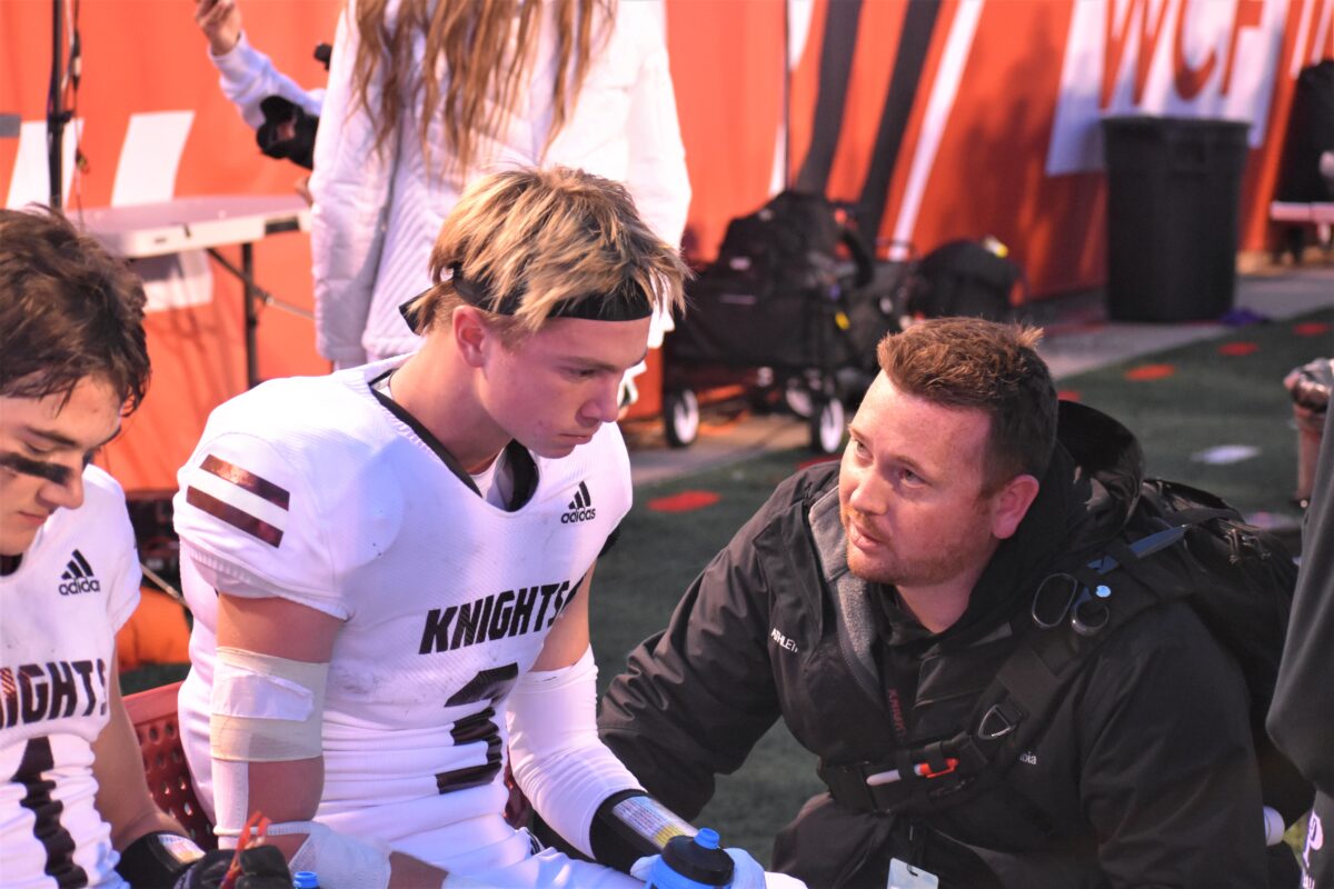 - Lone Peak’s Crew McChesney (left) is checked out by a trainer after scoring what proved to be the game-winning touchdown against Corner Canyon in the 6A state football championship game at Rice-Eccles Stadium in Salt Lake City on Friday, Nov. 19, 2021. (Darnell Dickson/Daily Herald)