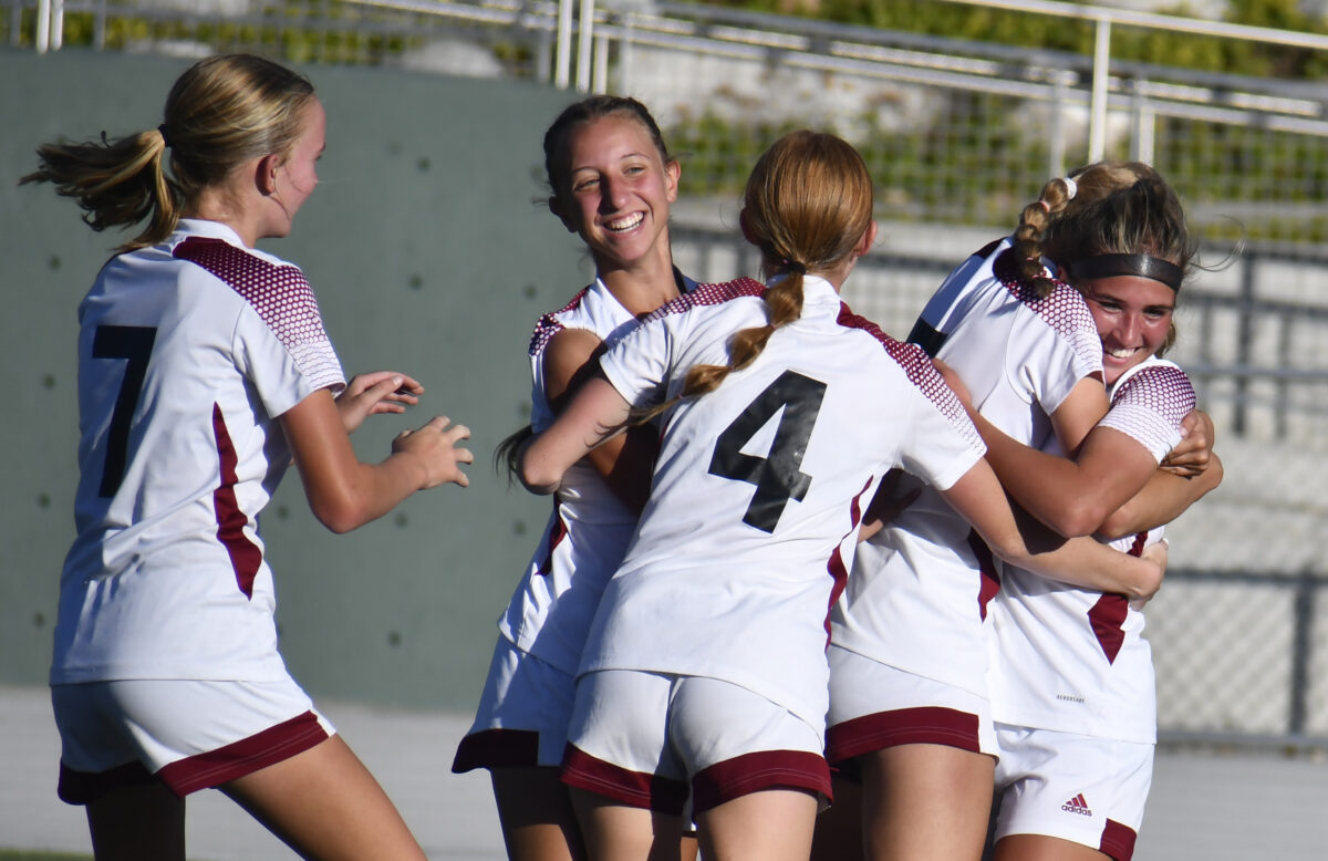 - Cedar Valley players celebrate with junior Aubrey King (right) after she scored a goal during the 6A quarterfinal match against Olympus in Salt Lake City on Thursday, Oct. 13, 2022.
