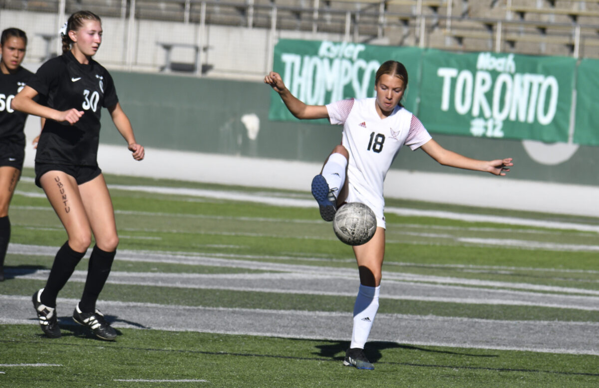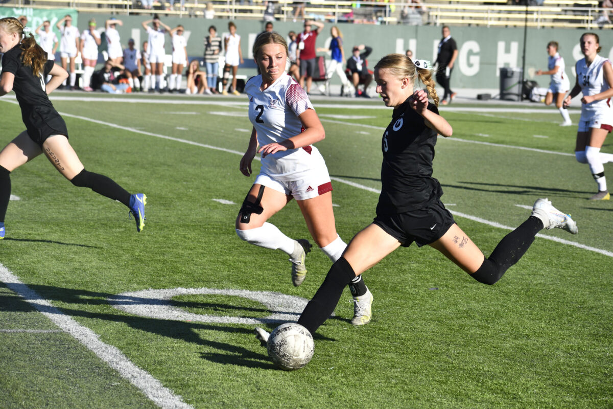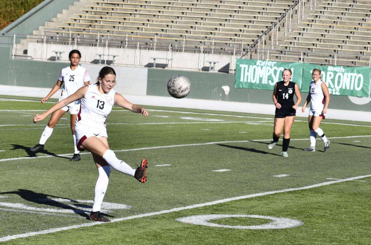 - Cedar Valley senior Bailey McArthur takes a free kick during the 6A quarterfinal match against Olympus in Salt Lake City on Thursday, Oct. 13, 2022.