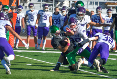 - Provo defenders make a tackle during the 5A second round game against Box Elder in Provo on Friday, Oct. 28, 2022.