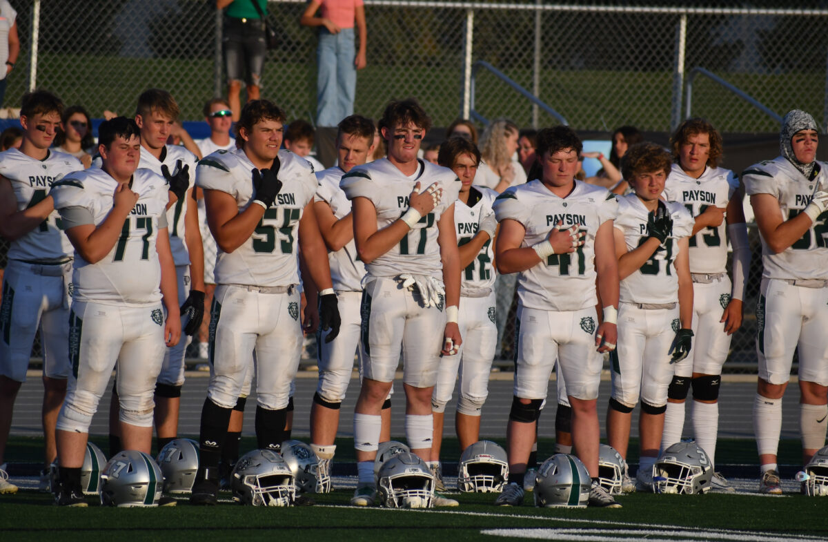 - Payson players stand for the national anthem before the Region 7 game against Timpanogos in Orem on Thursday, Sept. 8, 2022.