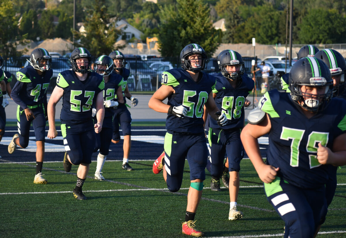 - Timpanogos players run onto the field before the Region 7 game against Timpanogos in Orem on Thursday, Sept. 8, 2022.